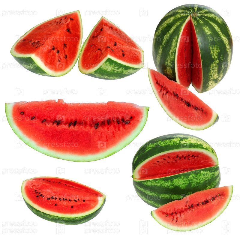 Набор ломтиков свежего арбуза, изолированный на белом фоне