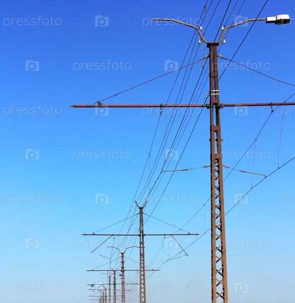 Железнодорожные цепные линии на фоне ясного голубого неба