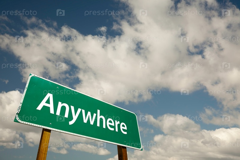 Зеленый дорожный знак ГДЕ УГОДНО на фоне живописного неба