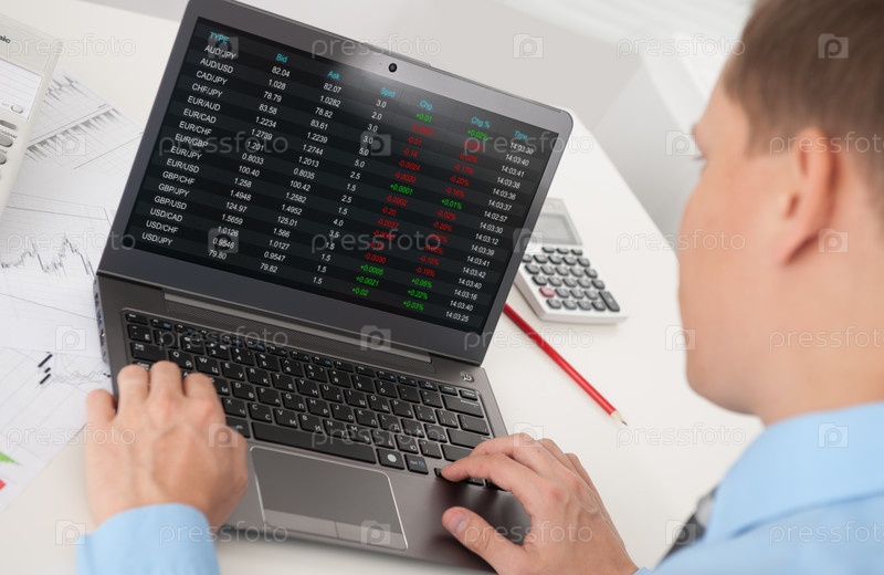Деловой человек проводит анализ фондового рынка на ноутбуке