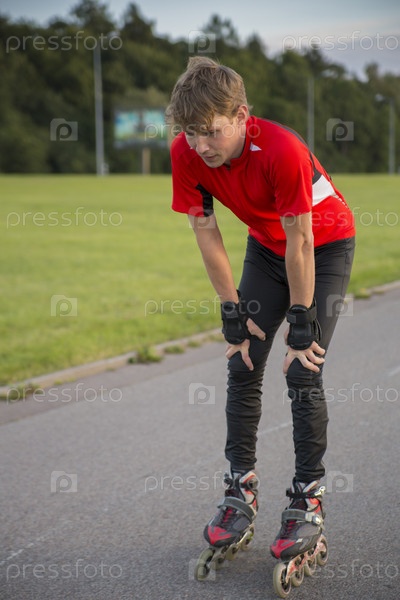 Спортсмен на роликовых коньках отдыхает от утомительных тренировок