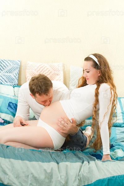 Счастливая беременная женщина с мужем дома на диване