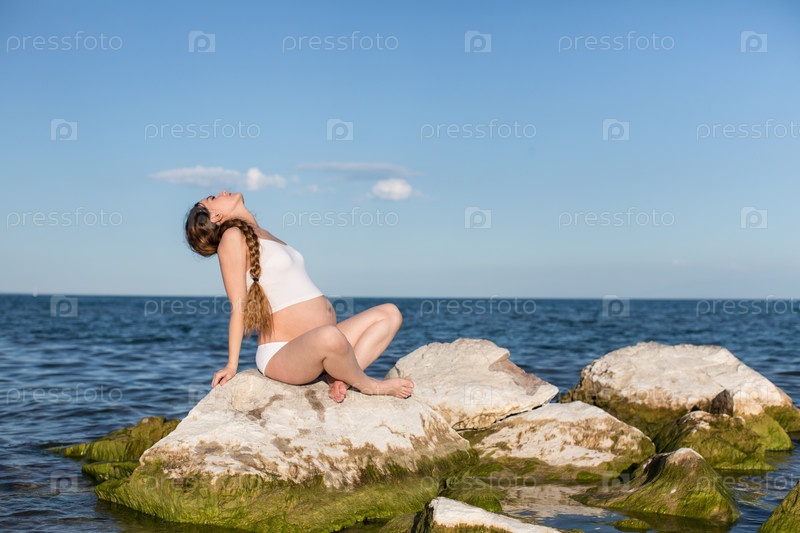 Беременная женщина с длинными волосами медитируя в позе Йога на море