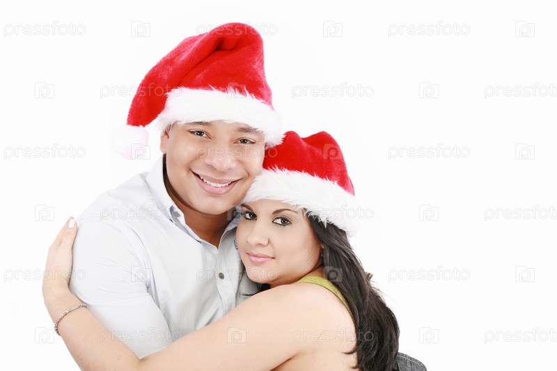 Счастливая красивая пара смотрит в камеру и поздравляет с Рождеством