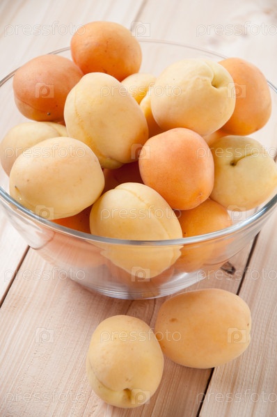 Стеклянная чаша со спелыми абрикосами на деревянных досках