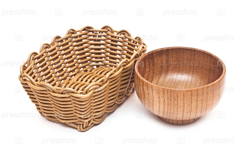 Пустая корзина и миска на белом фоне