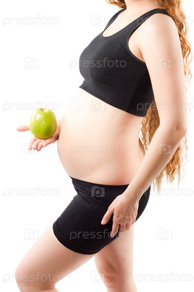 Здоровая беременная женщина с зеленым яблоком над белая диета и концепция органического питания