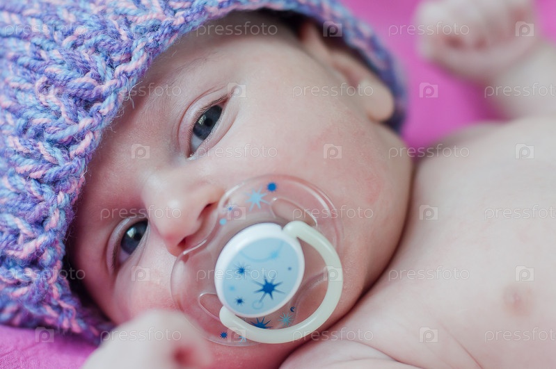 Маленький ребенок в шапочке с пустышкой