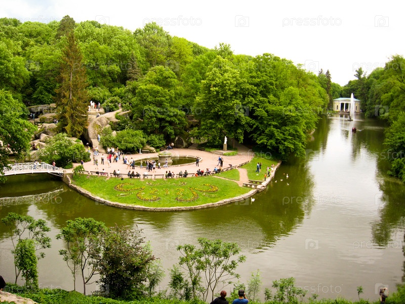 Красивый парк с озером и деревьями