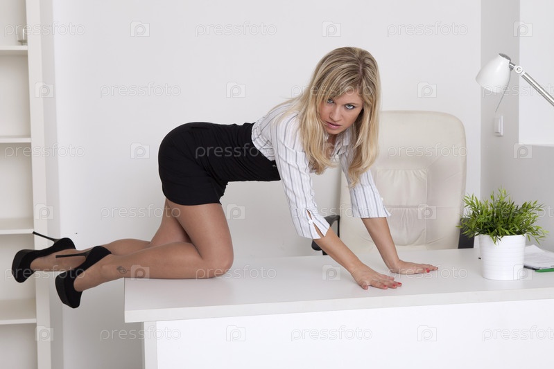 Молодая женщина в деловом костюме стоит на рабочем столе