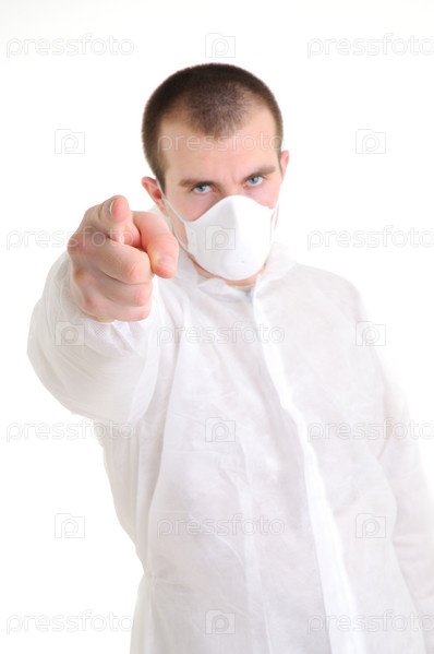 Человек в белом халате и респираторе