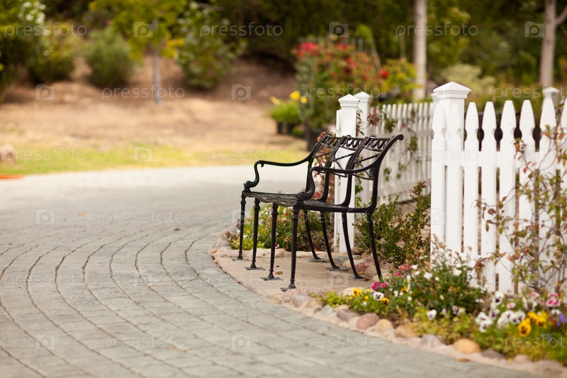 Скамейка возле белого забора