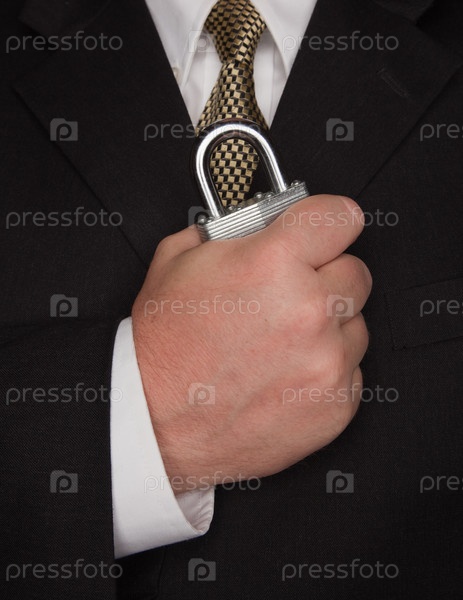 Бизнесмен держит большой замок
