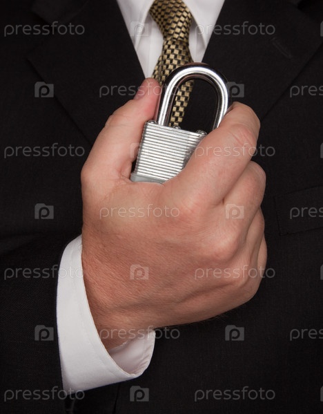 Бизнесмен держит большой замок