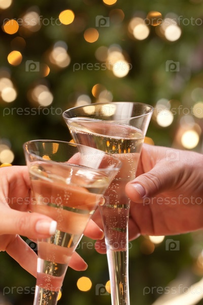 Мужчина и женщина поднимают бокалы с шампанским на фоне огней