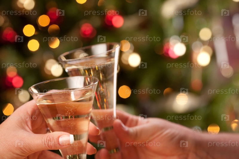 Мужчина и женщина поднимают бокалы с шампанским на фоне огней