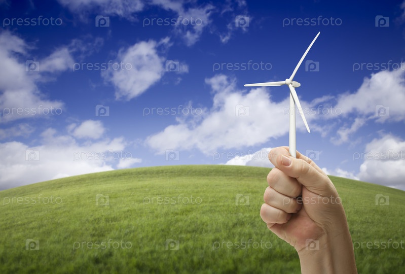 Мужская рука держит ветрогенератор на фоне травы