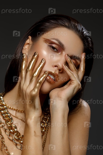 Красивая девушка с большим количеством золотых и бронзовых цепей