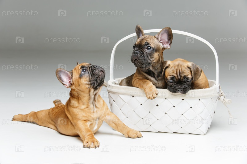 Милые щенки французского бульдога в корзине