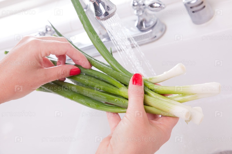 Женщина моет лук