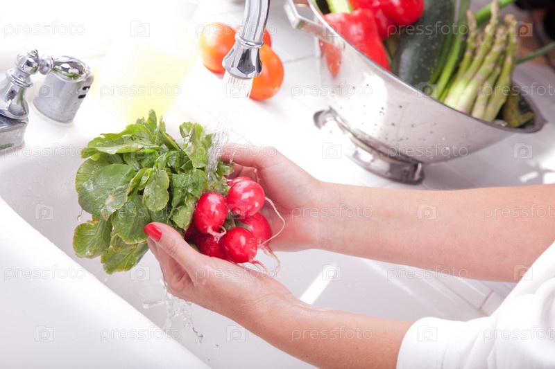 Женщина моет редис