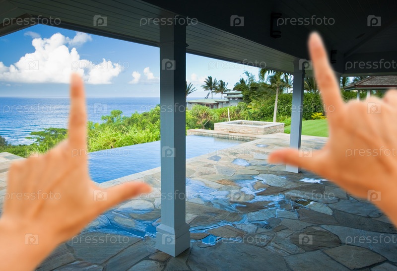 Руки кадрируют потрясающий вид на океан на Гавайях