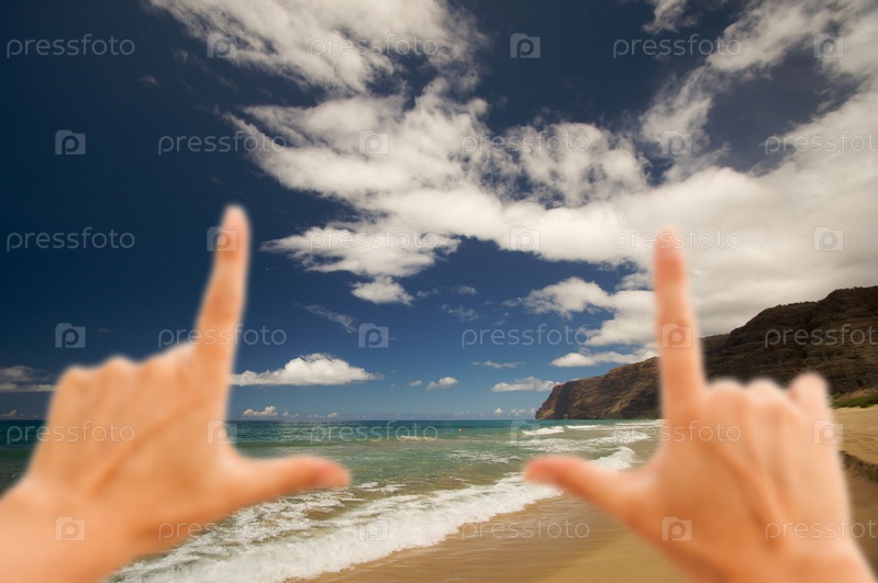 Женские руки в форме рамки над пляжем Полихали, Кауаи