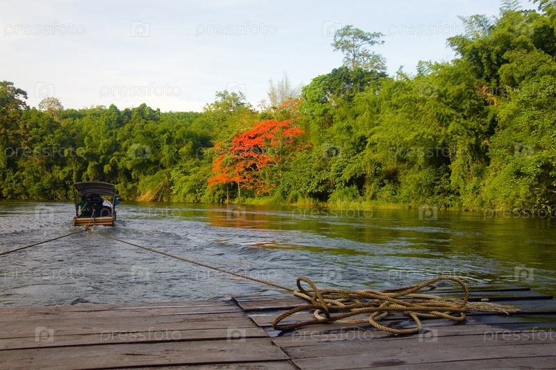 Лодка тянет плот на буксире