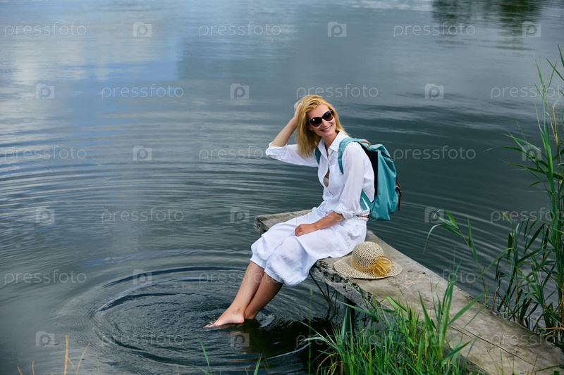 Молодая женщина отдыхает рядом с озером