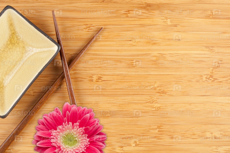 Тарелка, деревянные палочки и гербера на деревянной поверхности