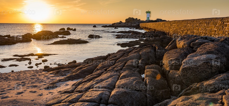 Скалистый берег и маяк в закате Тревиньонат, Бретань
