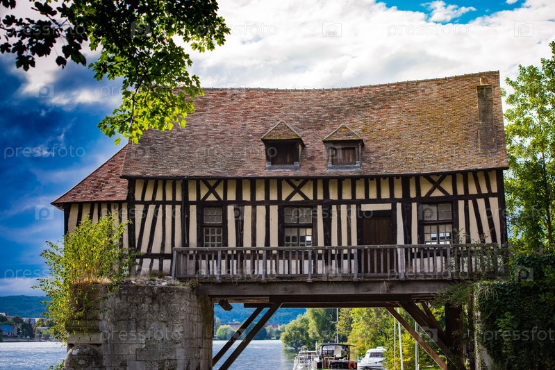 Старая мельница и дом на мосту через реку Сена, Нормандия, Франция
