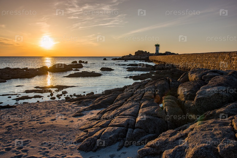 Скалистый берег и маяк в закате Тревиньонат, Бретань
