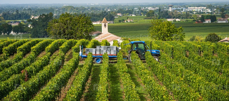Сбор урожая красного винограда в виноградниках Сент-Эмильон, Бордо