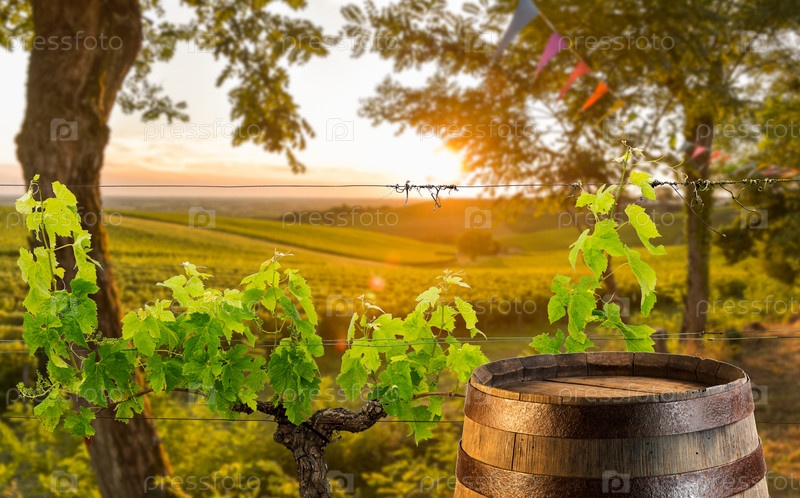 Бочка вина на винограднике в Бордо