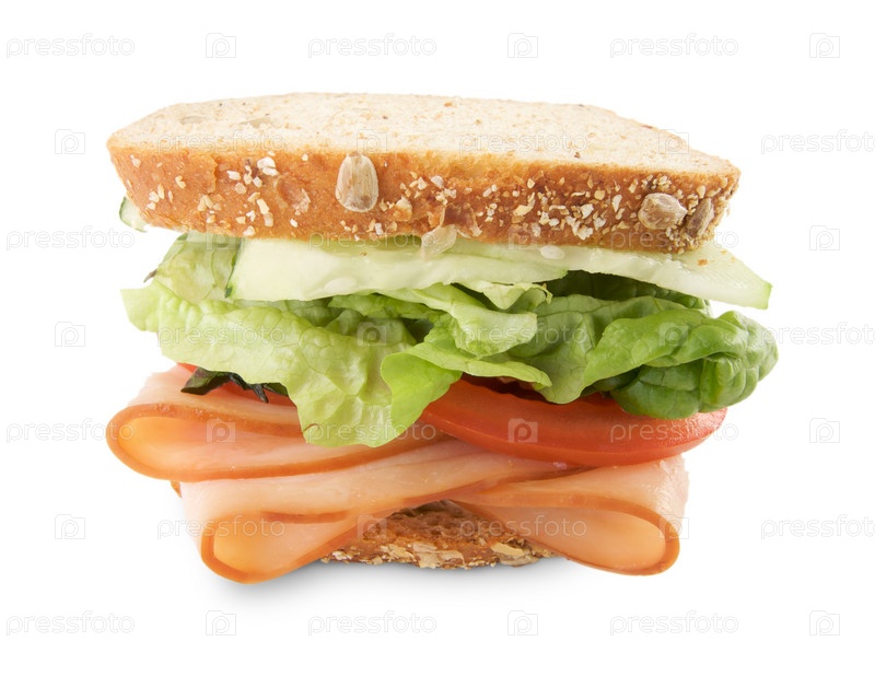 Бутерброд с овощами и нарезанным мясом, изолированный на белом