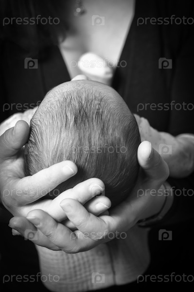 Молодая мать держа в руках голову своего ребенка