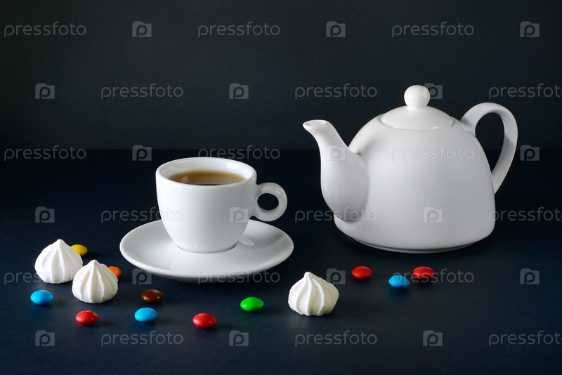 Белая чашка чая и чайник на черном фоне