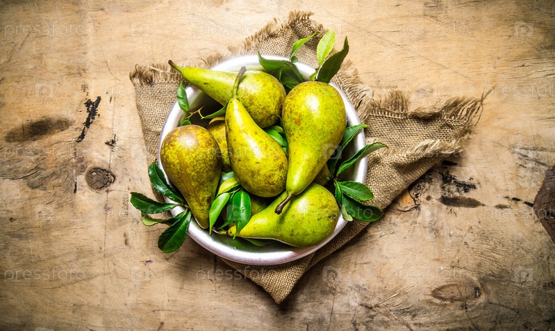 Груши с листьями в миске на старой ткани