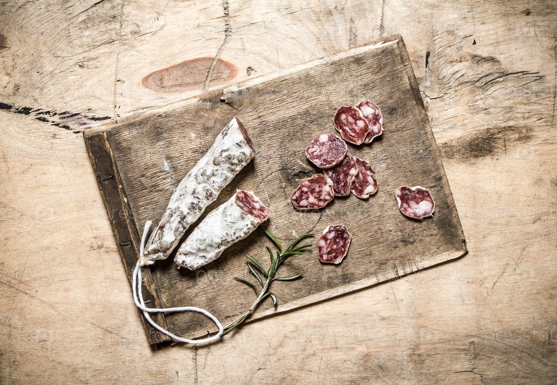 Салями нарезанная на деревянной доске