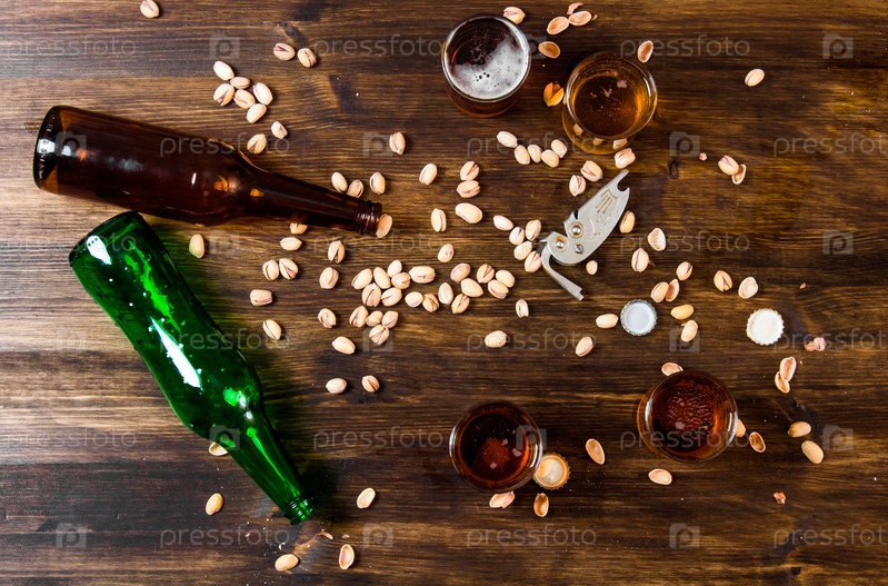 Четыре сорта пива с фисташками на деревянном столе