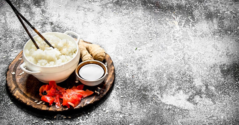 Азиатская еда. Вареный рис с соевым соусом и маринованным имбирем