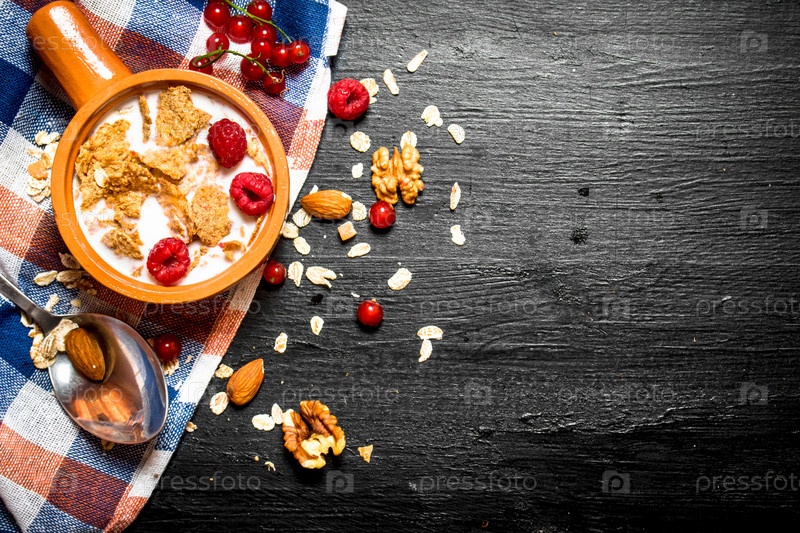 Мюсли с ягодами, орехами и молоком в миске