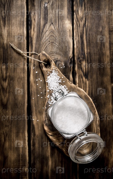 Соль в стеклянной банке на деревянной доске