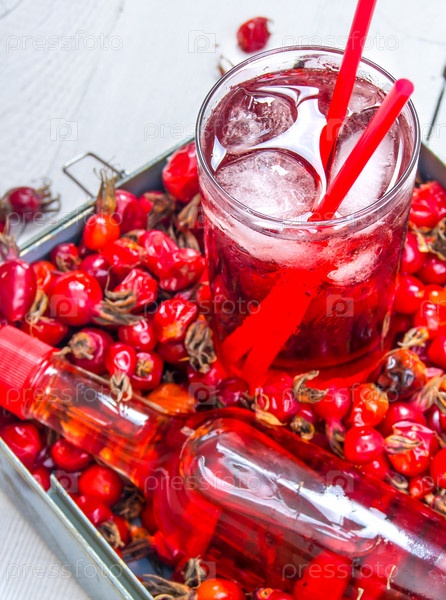 Коктейль с шиповником со льдом и ликером на белом деревянном столе