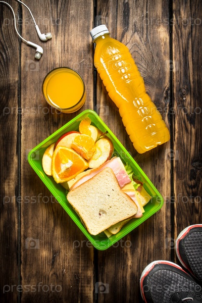 Кроссовки, наушники, апельсиновый сок, бутерброды и фрукты