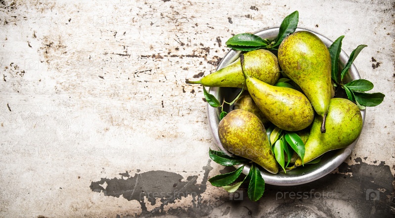 Свежие груши с листьями в миске