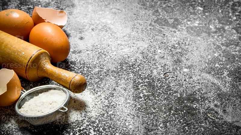Скалка со свежими яйцами и мукой на деревенский фоне