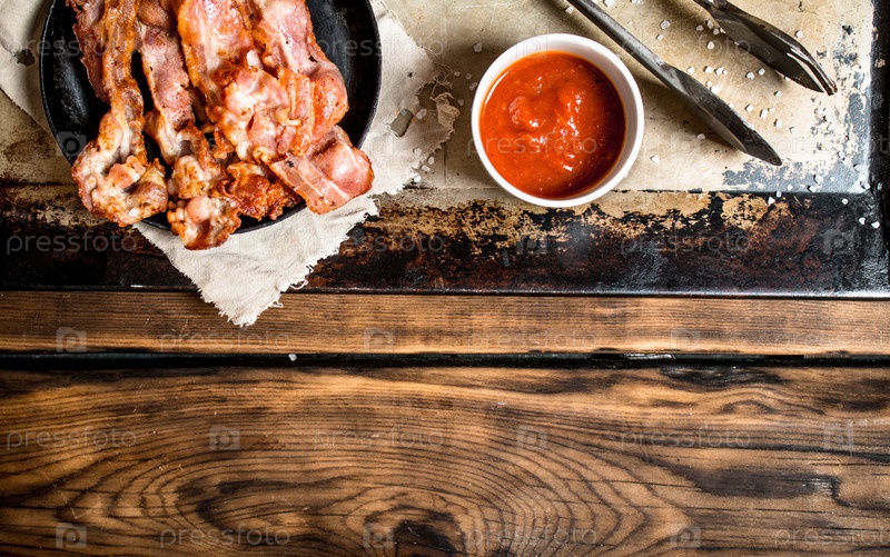 Жареный бекон на сковороде и томатный соус