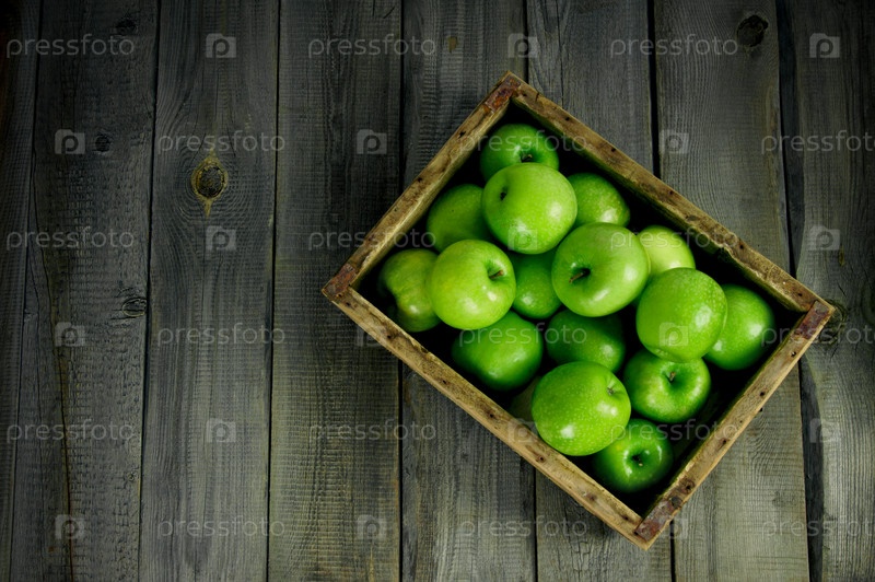 Много зеленых яблок в старой коробке